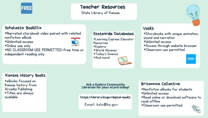 The Eudora Community Library Executive Board will meet on September 16, 2025, 6:30 PM, at the library. See that link above for more information.